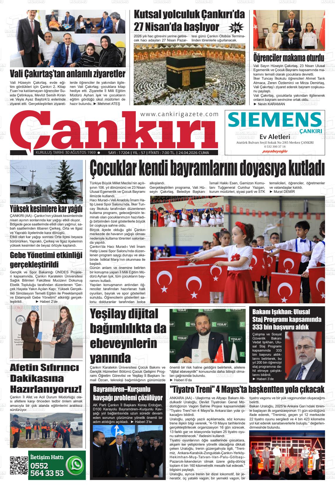 Çankırı Yerel Gazeteleri 24 Nisan 2026, Cuma Günü Manşeti