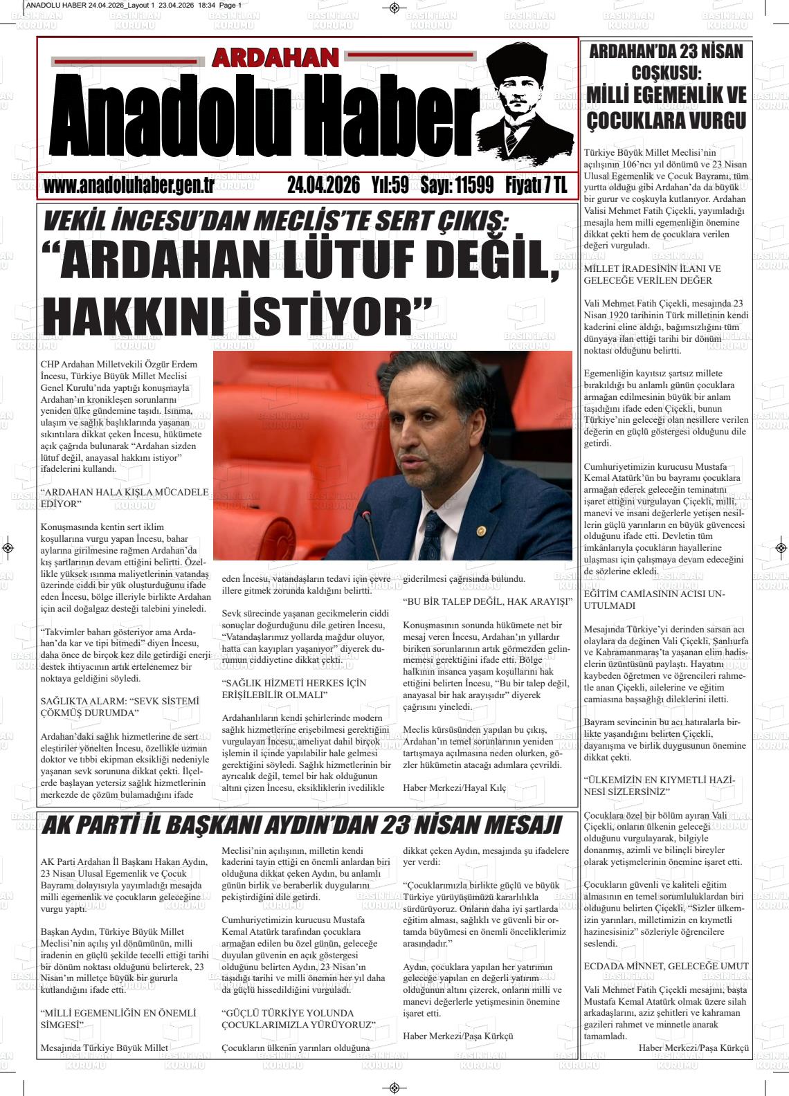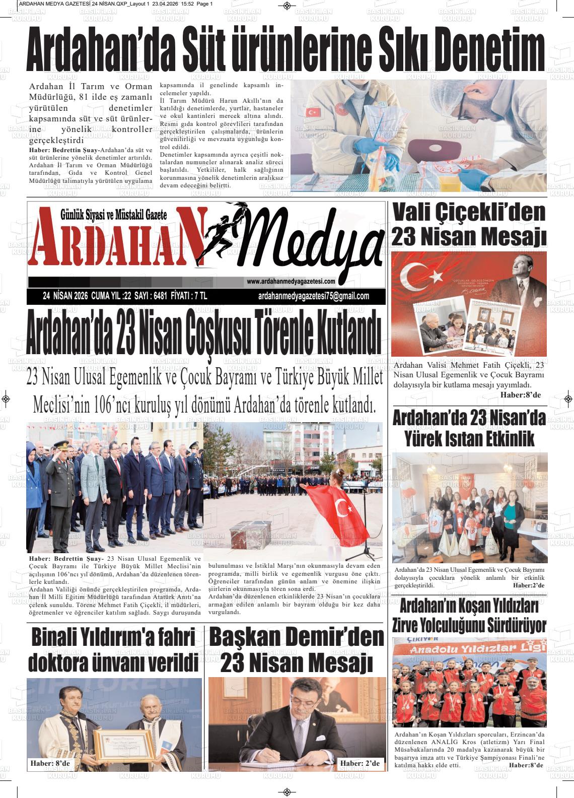 Ardahan Yerel Gazeteleri 24 Nisan 2026, Cuma Günü Manşeti