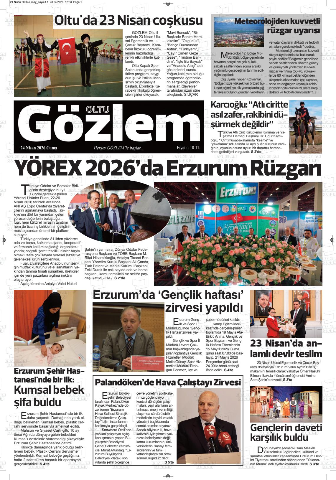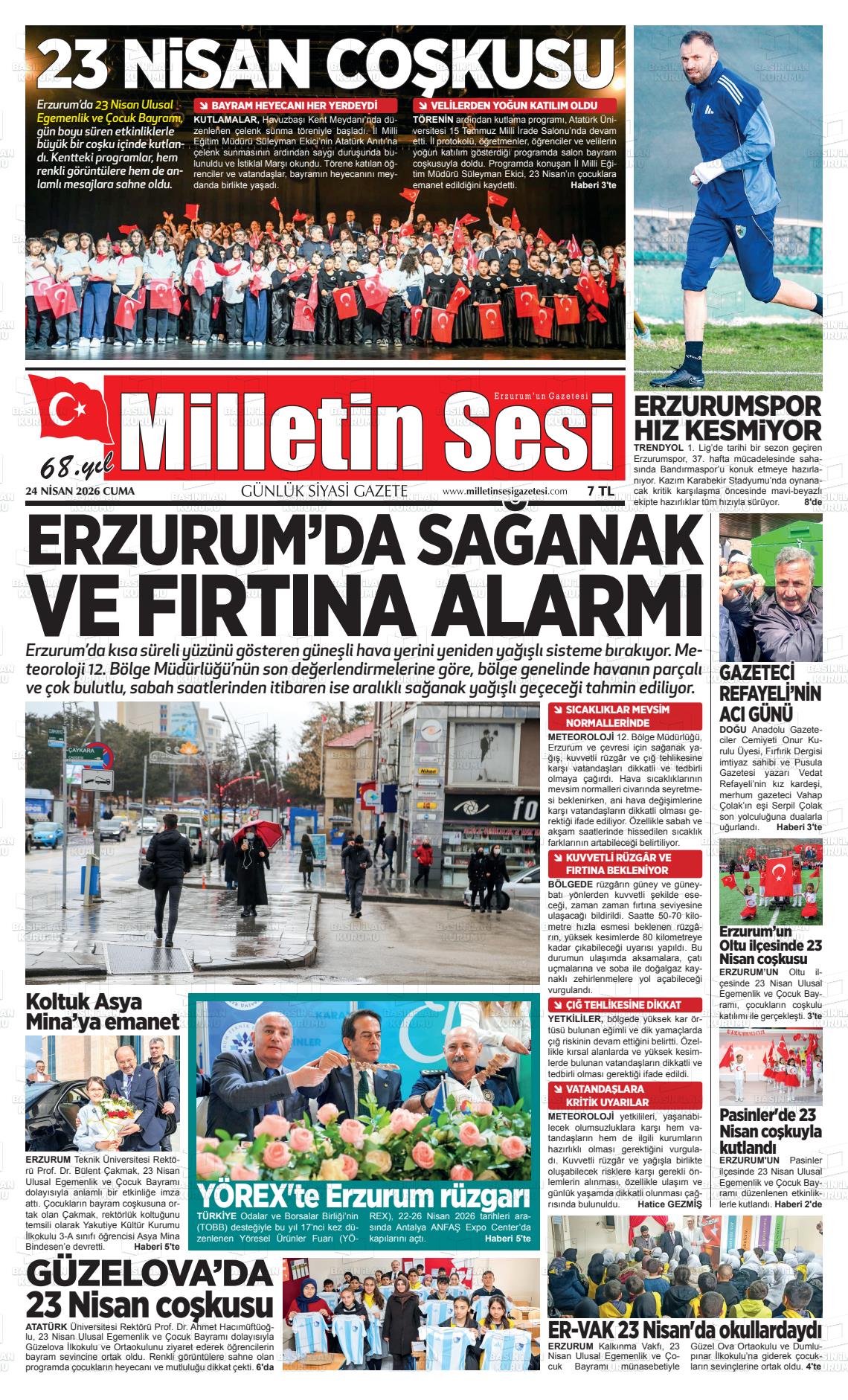 Erzurum Yerel Gazeteleri 24 Nisan 2026, Cuma Günü Manşeti