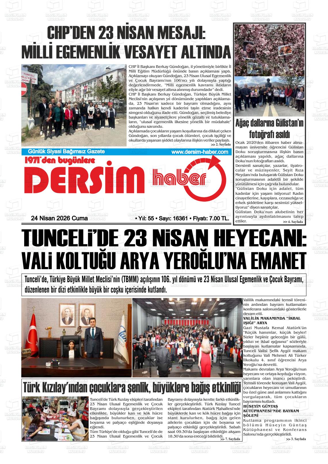 Tuncelİ Yerel Gazeteleri 24 Nisan 2026, Cuma Günü Manşeti